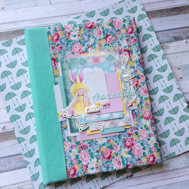 Обложка у папки обтянута натуральным льном и 100% хлопком, декорирована бумагой от ScrapBerrys и Скрапмир. Имя вырезано при помощи моего помощника ScunNCut и покрыто эмбоссингом.